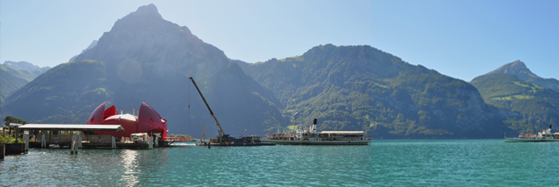 Eimal mehr stand das Rollhotel auf einem unschlagbaren Platz – nämlich zvorderschtvore auf dem SGV-Landesteg im Hafen von Flüelen! Auf drei Seiten nichts als Wasser, Berge, ein Dorf und eine Seerose! Was will man da Meer! Zwischen Bahnhof und Hafen, mitten im Ursprung der Verkehrs- und Tourismusgeschichte der Zentralschweiz. Anschaulicher könnte sich die Geschichte und Bedeutung des Ortes nicht präsentieren: Auf der einen Seite gleitet ein topmoderner ICN vorbei, auf der anderen Seite legt ein majestätisches Dampfschiff an. Und in der Ferne windet sich die Axenstrasse, ein touristisches Highlight der Belle Epoque, um die Bergflanken über dem Urnersee. Das lebendige Museum auf der Seerose erhält hier einen grandiosen Aussenbereich. Dies macht den Tagesbesuch zu einem faszinierenden Erlebnis, aber auch am Abend bietet die Seerose neben dem Rollhotel ein vielfältiges Programm und eine entspannte Atmosphäre.